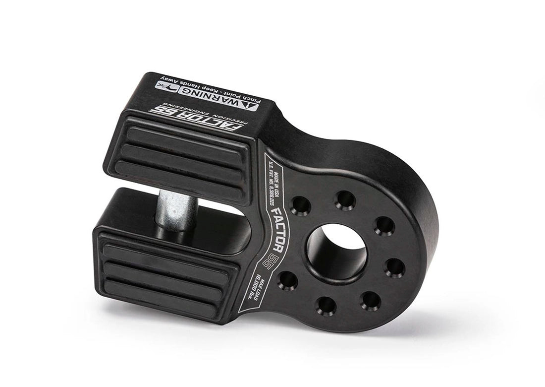 FlatLink is Factor 55’s original folding winch shackle bracket. Features include a precision shackle mounting hole and a folding design giving you a lower profile, and allowing for a better approach angle than ProLink. FlatLink doesn’t require splicing and is compatible with steel or synthetic ropes. It attaches with a super-strong aerospace-grade double-shear titanium pin and snap ring, which is easily installed in minutes. The EPDM rubber guards protect alloy fairleads, prevents rattling, and is securely attached to the FlatLink with four barbed tips.